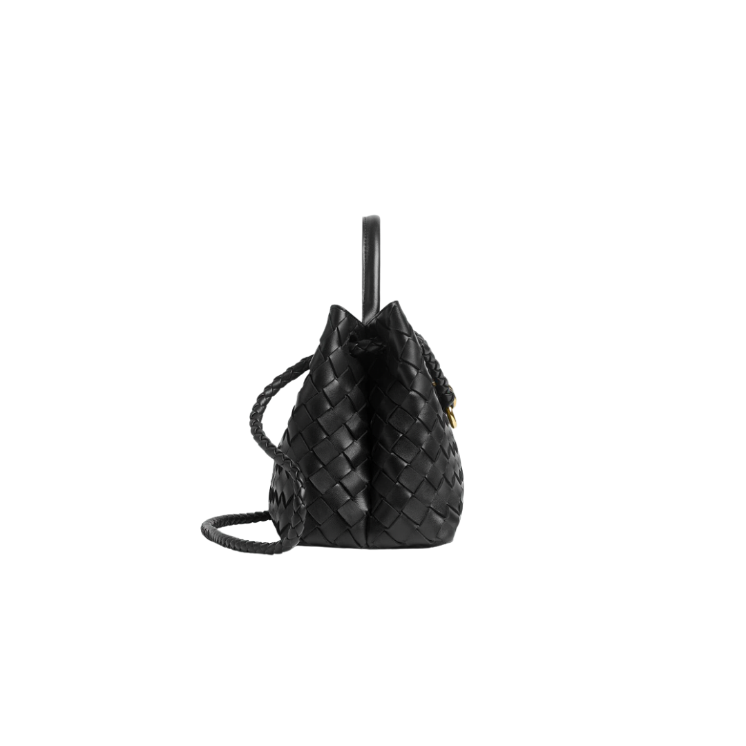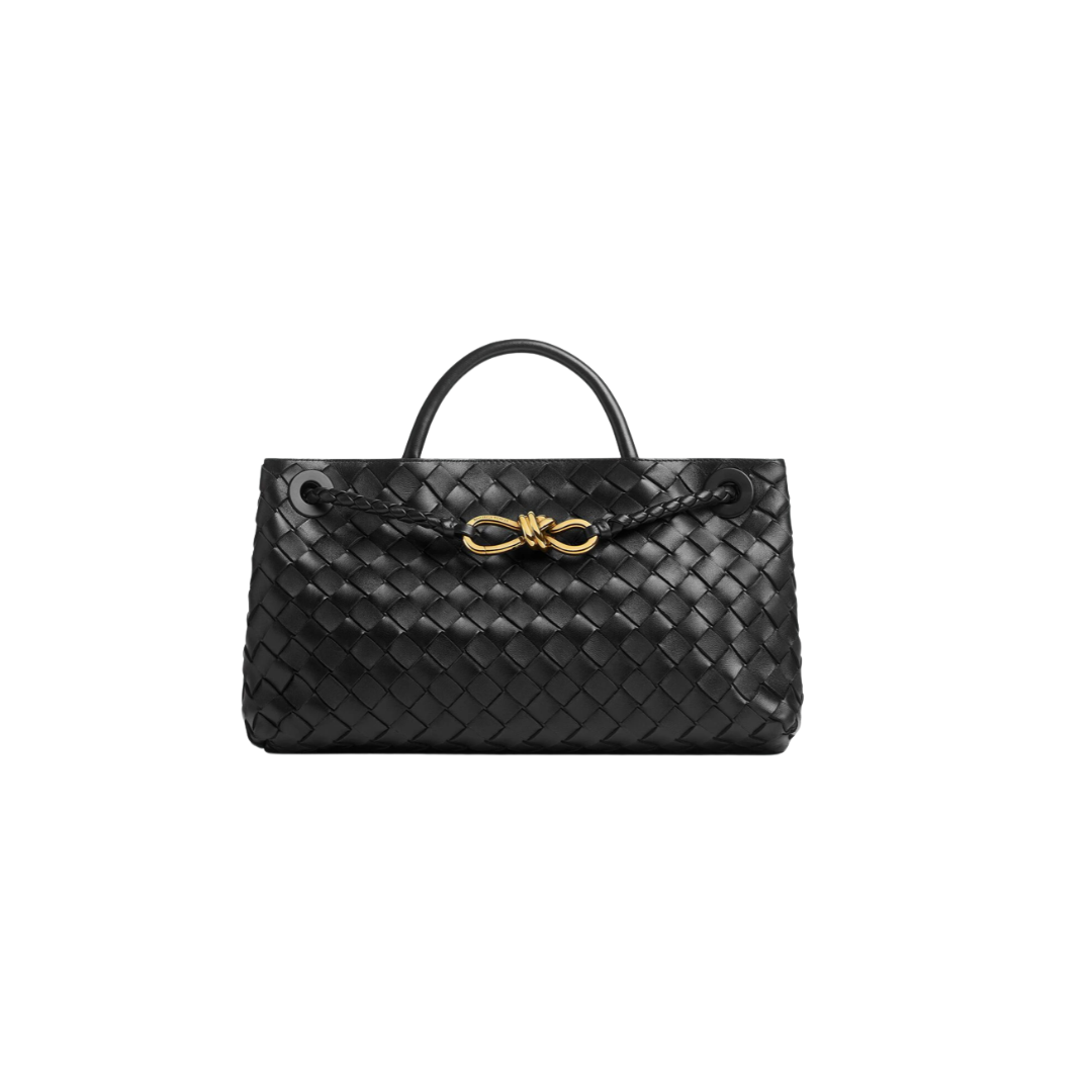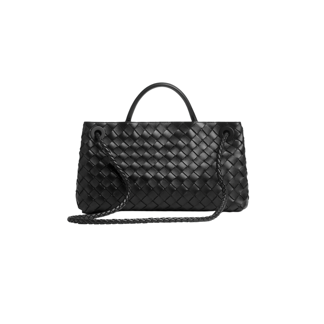 Top handle bag with elongated silhouette in supple Intrecciato leather with signature knot detail and sliding cross-body strap.